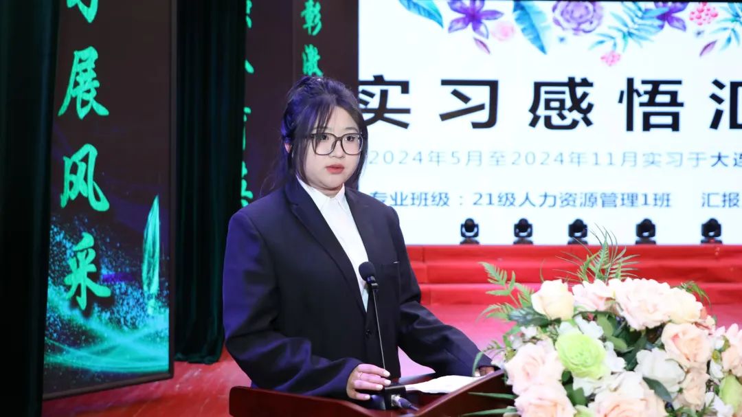 会上,21级人力资源管理专业史露凝作为优秀实习生代表发言。在发言中,她表达了对学校培养的感激之情。她表示,在实习过程中,不仅学到了专业知识,还锻炼了实践能力和团队合作能力,通过与公司员工的合作和交流学习,对企业的运行机制和管理模式有了更深层次的理解,更加清晰地认识到了自己未来发展的方向和目标。